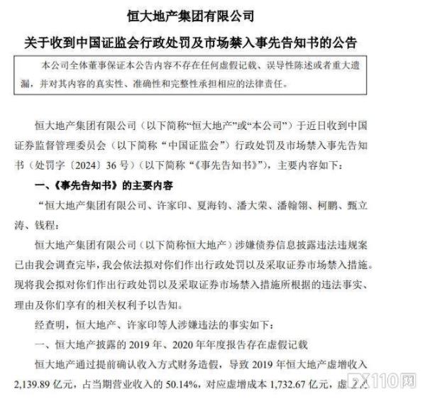 18日,恒大地产发布《关于收到中国证监会行政处罚及市场禁入事先告知书的公告》称,中国证监会在调查后也对该公司及其几名前高管进行了处罚。