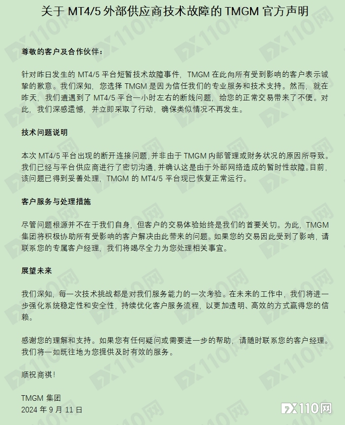 11日上午,TMGM对此次软件断线事故发布了官方声明,在致歉的同时也对此次事故作出了解释与回应。TMGM表示,10日上午的MT4/5断开连接是平台供应商出了问题,由于外部网络造成的暂时性故障,该问题已得到妥善处理。