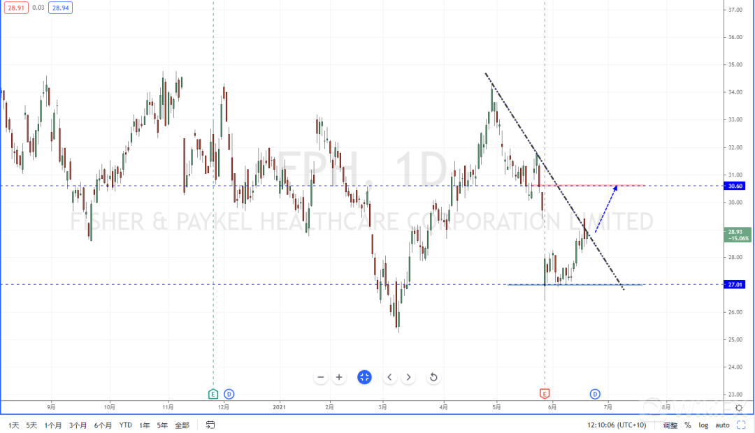 FPH:近期市场持续处于在低迷弱势阶段中,从ETF产业标的显示中,大部分行业都处于在下行调整中。由于市场疲劳,人气也处于低迷状态。从FPH目前趋势在前期关键位置止跌后上行,并且其价格也正冲击上方的跳空缺口位置。同时也处于下降趋势线的关键位置附近。可适当关注价格调整后向上运行的多头机会,上方目标位置参考30.60一带。