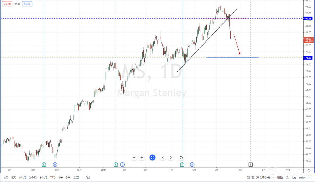 MS:目前行情在近期受到市场环境的影响,使得大部分产业大幅走弱,其中金融标的产业处于在领地状态,也处于其相关的类股在高位持续走弱。从MS目前趋势表现,价格在上方创出新高后回落,并且有效跌破水平支撑带以及上升趋势线。空头流向已经确认,可适当关注价格调整后的继续下行的空头机会,下方目标位置参考78.09附近。