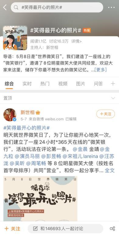 据了解,“微笑银行”还邀请了金晨、金靖、马丽、彭昱畅、宋祖儿、汪苏泷、吴昕、周笔畅(按姓名首字母排序)等8位明星微笑大使共同“营业”,他们会把自己私藏的、笑得最开心的照片和背后的故事分享出来。微笑日当天,#笑得最开心的照片#成功登陆微博热搜,24小时阅读量破1亿。
