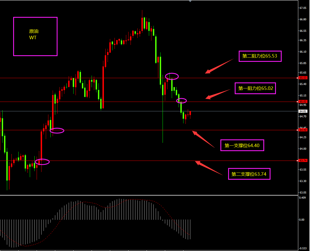 技术点评:原油昨日收阴线,价格高位回落,多头力度大幅减弱而空头大幅增强,上方形成双顶,日内更多以逢高看空为主?小时图原油期间连续阴线回落,MACD转移至0轴之下,空头占优,底部目前无明显大阳线立足,多头不强,日内更多以震荡以及震荡下行为主?
