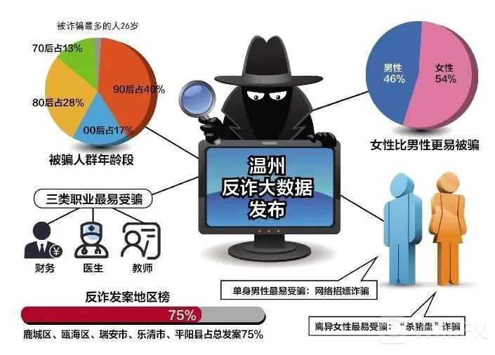 近日,温州市反诈中心发布该市的反诈大数据,据数据显示,80后、90后是最易被骗群体,被骗平均年龄31.2岁,被骗人数最多的年龄是26岁,被骗人年龄最大的85岁,最小的8岁,财务、医生、老师三类职业被骗较多。