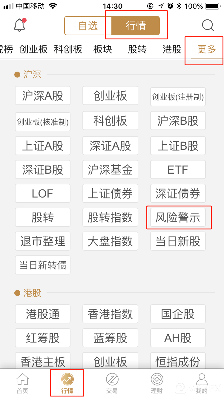 掌中投—行情—更多—风险警示。