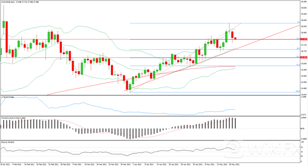 日线级别在前一日十字星后小幅收跌,受到27.58位置支撑,MACD上行动能减弱,RSI从临近超买状态回复,4小时级别布林带口开始收窄,价格跌破布林带中轨,MACD上行动能继续减弱,RSI跌破50轴线,今日空单从27.9入场,止损在28.35,止盈在27.25