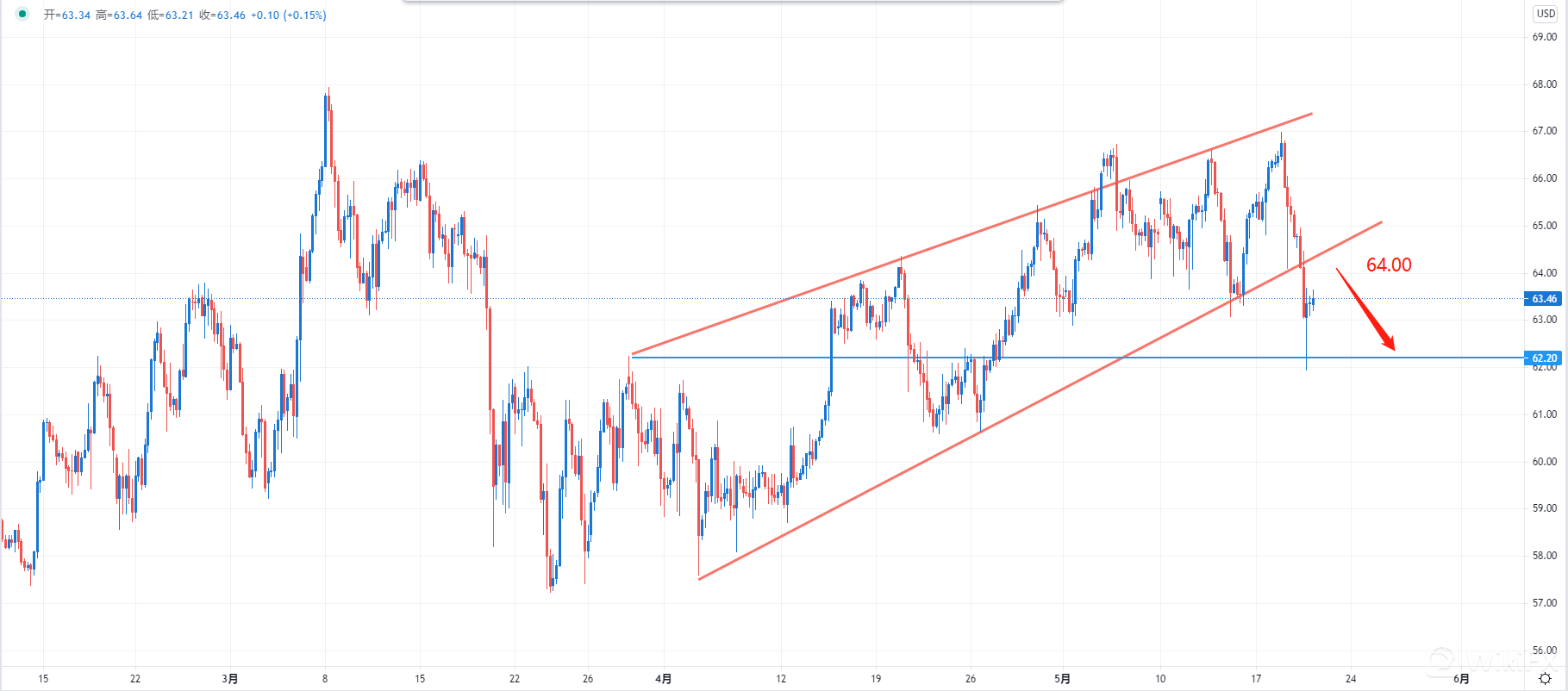 【交易策略】:建议投资者可考虑64.00附近做空,止盈65.50附近,止盈62.50附近。