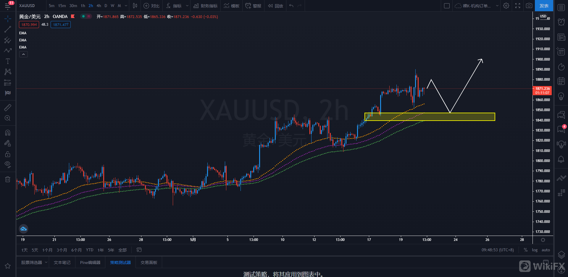 策略解析:黄金2小时上升趋势强劲,价格继续保持并站稳在均线系统上方运行,后市或将继续持续上行,逢低买入为主。日内关注价格再次回踩1847-1840区域的机会,可择机逢低买入黄金,上看目标1900一线附近甚至更高。