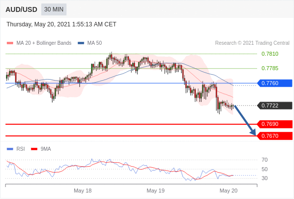 交易策略: 在 0.7760 之下,看跌,目标价位为 0.7690 ,然后为 0.7670 。