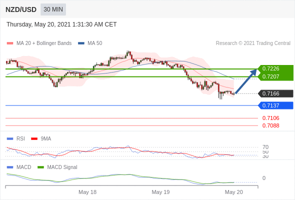 新西兰元/美元 当日内: 有上涨的可能,目标价位定在 0.7226 。