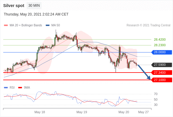交易策略: 在 28.0000 之下,看跌,目标价位为 27.3400 ,然后为 27.1000 。