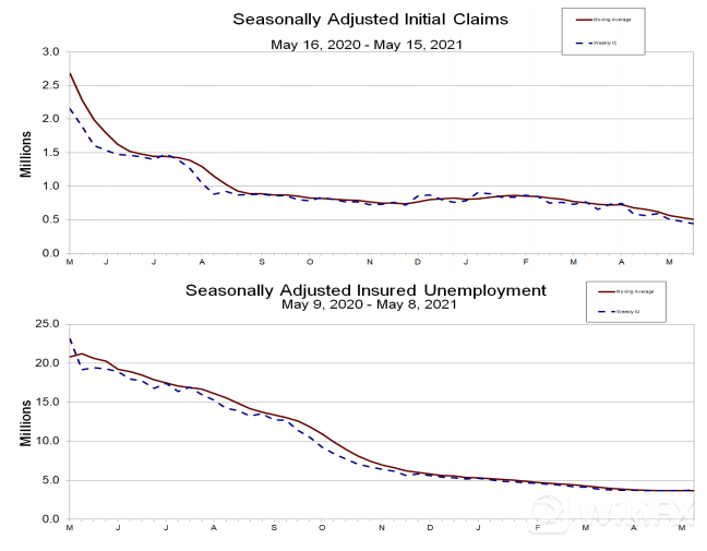 有分析指出,停发失业救济的原因之一,可能是对联邦失业金的增加使人们不愿找工作的担忧,因为尽管各类失业救济的申请呈下降趋势,但4月的非农仅为26.6万人,远远低于市场当时预期的100万人。