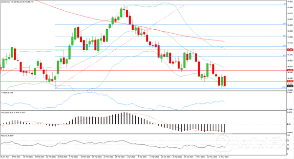日线级别大幅收跌,收回前一日全部涨幅走出吞没形态,跌破89.95支撑阻力位,MACD下行动能增强,RSI偏向空方,4小时级别接连收跌跌回林带中轨之下,MACD下行动能重新增强,RSI偏向空方临近超卖,预计今日将延续跌势。