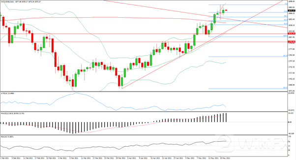 日线级别收出一跟短阳柱,带长上下影线,日内上下试探逾20美元,MACD上行动能增强,RSI仍处于超买状态。4小时级别布林带口继续收窄,价格在布林带中轨受到支撑,MACD顶背离开始发力,上行动能开始减弱,RSI偏向多方,今日空单在1883入场,止损1891,止盈1864