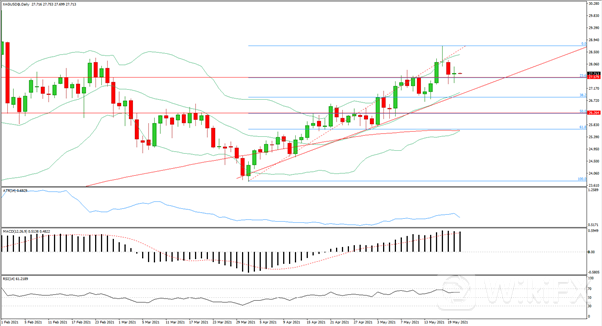 日线级别在支撑位之上收出一颗十字星,下方受到27.58位置支撑,MACD上行动能减弱,RSI从临近超买状态回复,4小时级别在布林带中轨受阻,MACD上行动能继续减弱,RSI仍在50轴线附近试探,今日激进空单在27.9入场,止损28.35,止盈在27.5,27.25.
