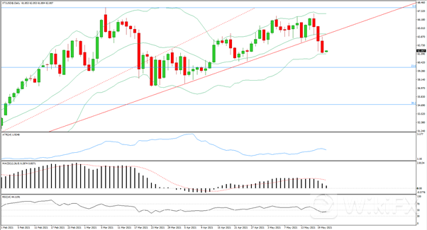 日线级别连续三日大幅收跌,跌破上行趋势线后回踩继续下跌,MACD上行动能减弱,RSI跌破50轴线,布林带口收平略带支撑作用,4小时级别跌破200均线支撑,在低位收出一颗十字星,MACD下行动能增强,RSI处于超卖状态。今日空单在63.25附近入场,止损64,止盈61。