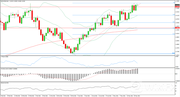 日线级别大幅收涨走出吞没形态,收回前一日全部跌幅,价格涨回1.2205阻力位置之上,MACD上行动能增强,RSI偏向多方,4小时级别受到布林带中轨支撑后连收一串短阳线,MACD上行动能增强,RSI偏向多方,今日多方在1.2185附近入场,止损1.216,止盈1.2243.