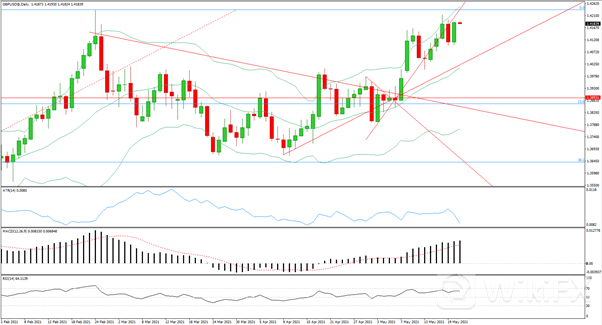 日线级别大幅收涨走出吞没形态,整体仍沿布林带上轨单边上行,MACD上行动能重新增强,RSI偏向多方,4小时级别在低位收出三颗十字星后站回布林带中轨之上,MACD上行动能重新增强,RSI偏向多方,今日多单在1.4158附近入场,止损在1.4100,止盈在1.422