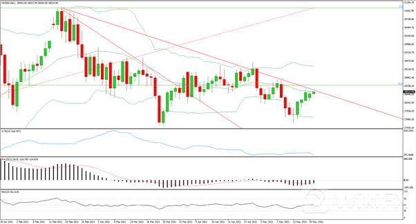 日线级别跳空后小幅收涨,上方仍受到布林带中轨和下行趋势线阻力,MACD下行动能继续减弱,RSI向上试探50轴线,4小时级别价格在高位盘整,多次向上试探后仍未突破,上方面临下行趋势线与200均线阻力,MACD上行动能势头不足,RSI偏向多方,今日空单在28580入场,止损在28750,止盈在28250附近