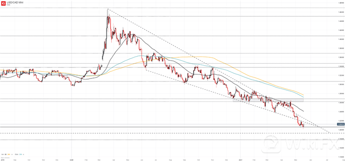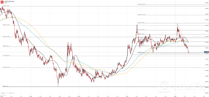 加元(USD/CAD)价格图表:每周时间框架(2002年1月- 2021年5月)
