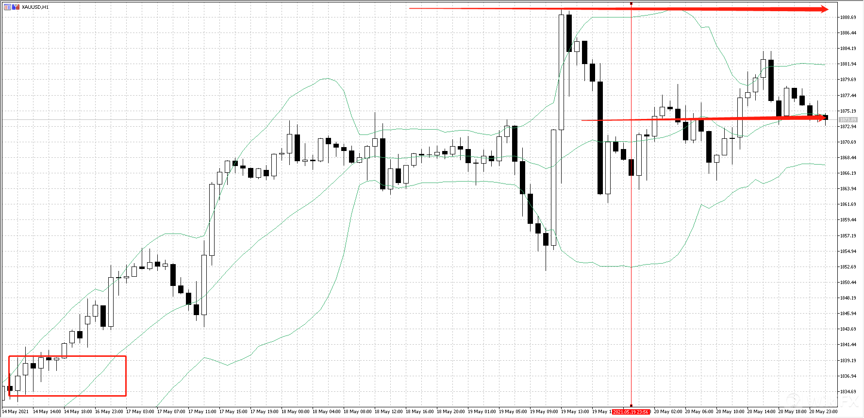 最新公布的截止5月15日当周初请失业金人数为44.4万人,创下疫情以来的最低水平。数据公布后美元指数不涨反跌,现货黄金的价格得到提振反弹到1883.79美元/盎司的日高位后,最终收盘于1875.98美元/盎司。现货黄金下一个支撑位是1830.00美元/盎司(图中红框内),上方的阻力位在1890美元/盎司附近(图中红色箭头处),如果黄金的价格在短期内测试了这个强力阻力位,黄金的下一个阻力位是1930.00美元/盎司。从30分钟图看黄金现在徘徊在1870.00美元/盎司的价位附近并进行调整(图中箭头方向)。