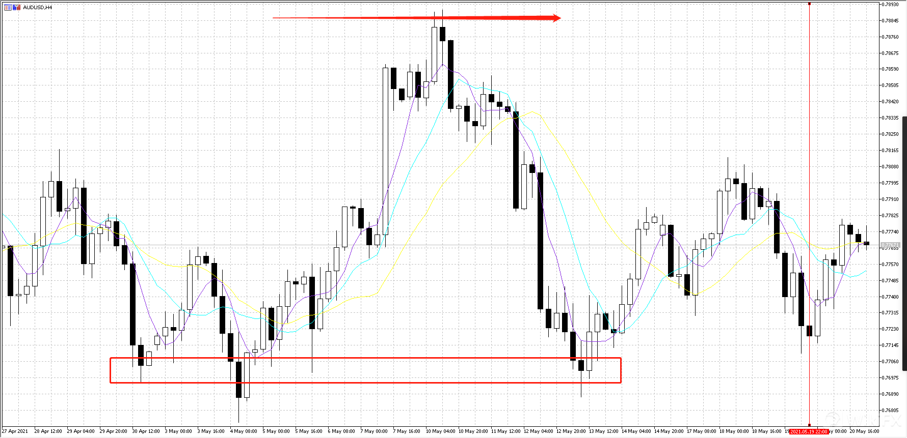 周四澳元兑美元走势受美元指数下跌的影响有所上涨,盘初开盘在0.7722的价位水平,随后上涨到0.7780的日高位,收盘在0.7770的价位附近。从4小时图来看,澳元兑美元近期比较强的支撑位在0.7680(图中红框内),如果这个价位被突破的话,澳元兑美元的下一个支撑位在0.7650,上方强阻力位是0.7900(图中红色箭头处),短期内澳元可能会在0.7650-0.7900区间内盘整。