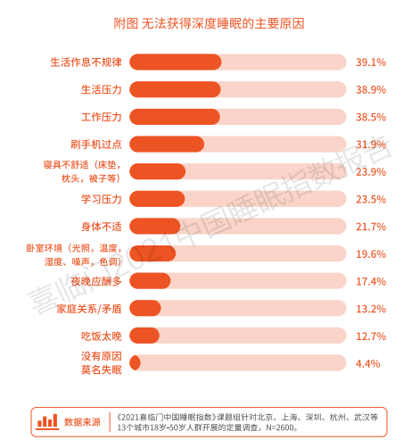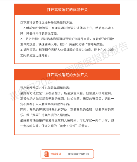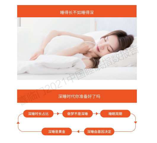 本文相关数据与结论,均摘自《2021喜临门中国睡眠指数报告》,该《报告》结合国内外睡眠科学领域的最新研究成果,由喜临门联合中国睡眠研究会共同发布,中国趋势营销服务创新机构知萌咨询作为调研机构,中国医疗健康专业知识智享平台《健康界》作为战略支持媒体,巨量引擎、春雨医生、蜗牛睡眠、咕咚运动等领先的互联网平台为协同支撑,深入分析12.8亿次国人睡眠行为,形成后疫情时代覆盖人群最广泛的中国人睡眠画像。