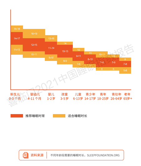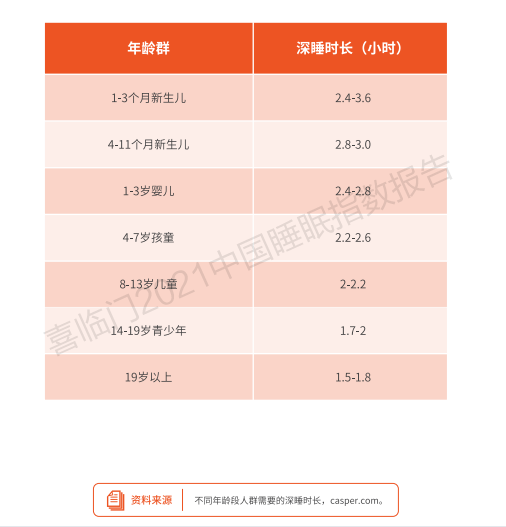 据美国睡眠组织机构表明,除睡眠时长外,人的一生中所需要的深睡也是不同的,深睡时长随着人体年龄的增长逐步减少,质量和时长也逐步降低,婴幼儿深睡时长最长,老人最少。