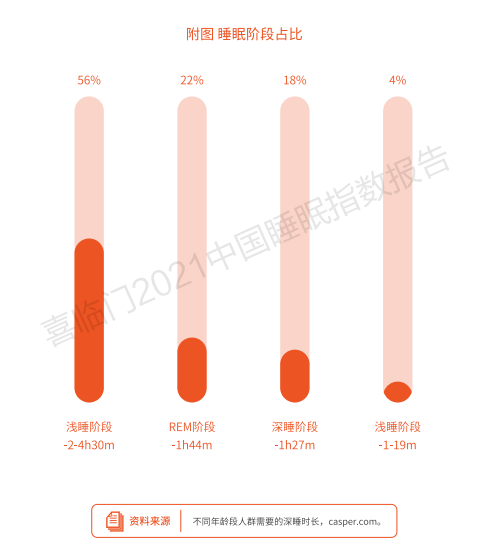在正常的人体睡眠周期中,深睡时长为1小时27分钟,占比18%,其他大部分时间为浅睡阶段,占比56%,为4小时30分钟。