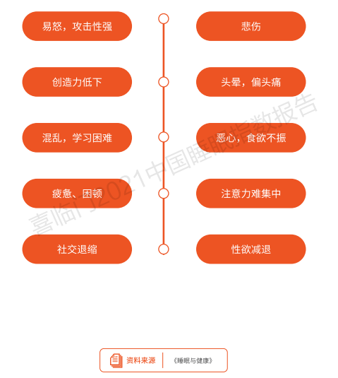《报告》显示,如果长期深睡不够,身体可能会出现一系列的有损健康的反应,例如:易怒、攻击性强、悲伤、头晕、偏头痛、注意力难集中等。