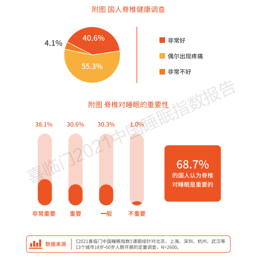调查显示,超一半国人的脊椎出现问题,认为偶尔出现疼痛的国人占比为55.3%,脊椎出现严重问题的占比4.1%,认为自己脊椎非常好的占比仅40.6%。而在脊椎与睡眠的重要性调查中,超过50%的群体认为脊椎对睡眠是重要的。