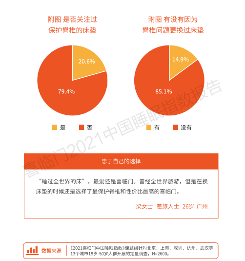 因此,部分国人因为脊椎问题关注并更换护脊床垫。《报告》显示,20.6%的人群关注过护脊床垫,14.9%的人群有过因脊椎问题更换过床垫的行为,代表床垫和脊椎以及深度睡眠是息息相关的。