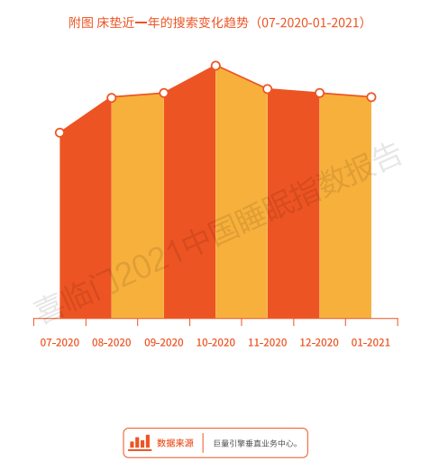 巨量引擎数据显示,“床垫”一词的搜索量在2020年下半年保持较高热度,说明国人对床垫改善睡眠的关注非常高。