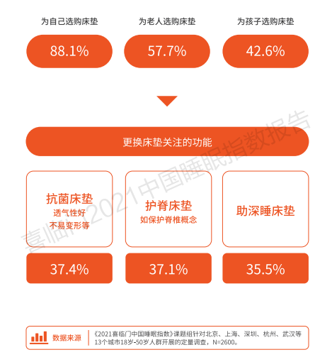 在购买床垫的人群中,大部分人会为自己购买床垫,占比88.1%;而排名第二、第三的则是为老人和孩子选购床垫,分别占比57.7%、42.6%。调查显示,37.4%的人群倾向于抗菌床垫,37.1%的人群想要保护脊椎的床垫,而助深睡功能的床垫也得到人们的认可,占比35.5%。