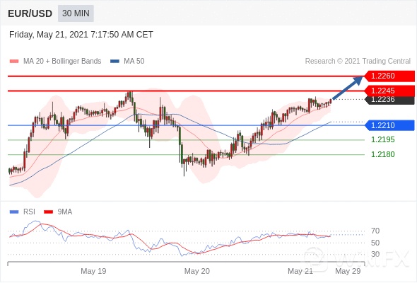 欧元/美元 当日内: 上升趋势。 转折点:1.2210 交易策略:在 1.2210 之上,看涨,目标价位为 1.2245 ,然后为 1.2260 。备选策略:在 1.2210 下,看空,目标价位定在 1.2195 ,然后为 1.2180。 技术点评:RSI技术指标向上运行。