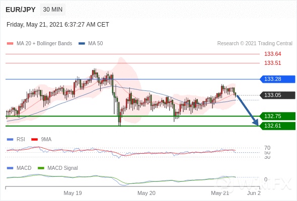 欧元/日元 当日内: 逐渐下跌,当 133.28 阻碍上行,则 132.61 为目标位。 133.28 作为转折点。 交易策略:逐渐下跌,当 133.28 阻碍上行,则 132.61 为目标位。备选策略:如突破 133.28 ,EUR/JPY 目标方向为 133.51 和 133.64 。 技术点评 :RSI技术指标小于中性区域50。 MACD技术指标处在其信号线之下 看多。 另外,价位低于其20天移动平均线 ( 133.07 ) 但高于其50天移动平均线 ( 132.98 )。
