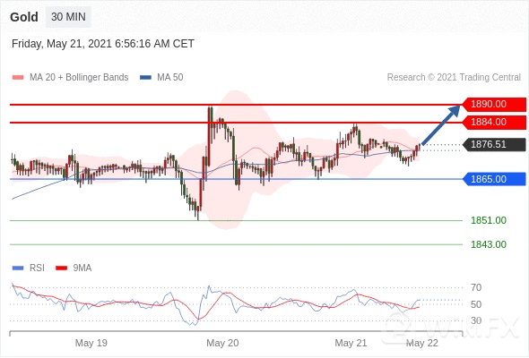 黄金 当日内: 超短线(当日内)支撑位在1865.00附近。 转折点:1865.00 交易策略:在 1865.00 之上,看涨,目标价位为 1884.00 ,然后为 1890.00 。备选策略:在 1865.00 下,看空,目标价位定在 1851.00 ,然后为 1843.00。 技术点评:RSI技术指标运行趋势复杂,倾向于上涨。