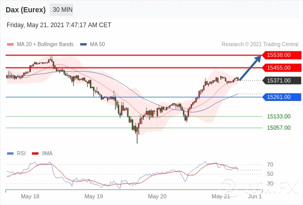 德国DAX指数期货(Eurex)当日内: 进一步上涨。 转折点:15261.00 交易策略:在 15261.00 之上,看涨,目标价位为 15455.00 ,然后为 15538.00 。备选策略:在 15261.00 下,看空,目标价位定在 15133.00 ,然后为 15057.00。 技术点评:RSI技术指标看涨,有进一步向上趋势。