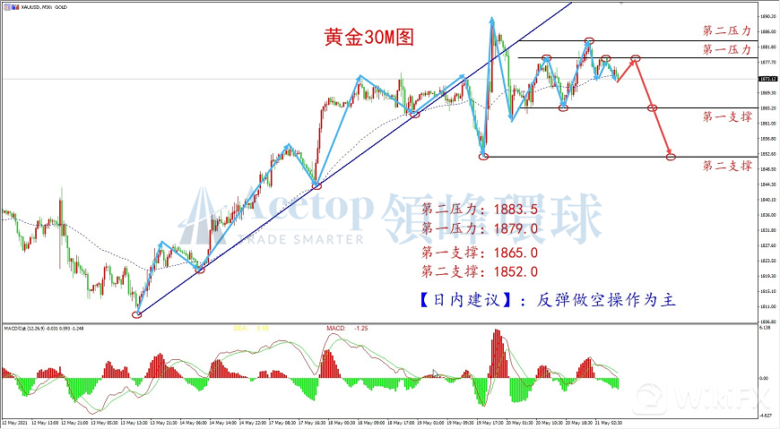 从上图黄金30M周期走势图来看, 黄金目前已跌破自1808.0附近起涨的上行趋势线,表明多头趋势或已终结,后市较大概率转为空头。黄金昨日震荡上行,但上行力度较弱,形态上来看,昨日的上涨可能只是下跌途中的三波反弹修复行情,后市仍有下跌可能。结合MACD指标来看,DIFF线与DEA线死叉向下,表明趋势为空头,日内操作可等待其反弹至1879.0附近尝试空单。