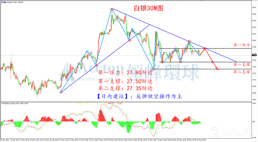 从上图白银30M周期走势图来看,白银在跌破自26.80附近起涨的上升趋势线后,高点逐渐降低,低点逐渐降低,表明走势转为空头,操作上可重点关注空单机会。结合MACD指标来看,DIFF线与DEA线死叉向下,并处于零轴下方,表明空头力量偏强,后市较大概率延续下跌,日内操作可在27.80附近尝试空单。