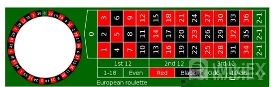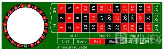 如果只有1-36这36个数字,那么玩家每次押1元,平均每36把赢一次,赢的35元正好抵消另外35把输的钱。但赌场在轮盘左边加了个“0”,玩家的赢面变成了1/37,赢的35元不足以抵消另外36把输的钱,赌场占据了1/37 = 2.70%的概率优势,也就是说玩家每押100元,平均要输2.7元。这还是“仁慈”的欧洲式轮盘赌,美国人觉得还不够黑,又加了个“00”(见下图)。 现在平均38把押中一次,玩家的劣势扩大了到5.3%。