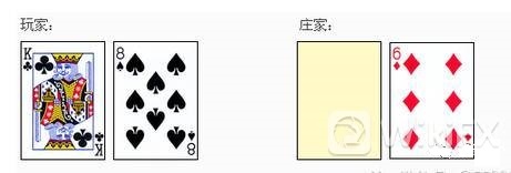 牌局开始,玩家和庄家各发两张牌,庄家的牌一明一暗(例如下图)。 然后玩家先做决定:可以抓牌,做加倍等特殊行动,或在任何时候选择“停”。如果玩家超过21点(爆牌)就直接输了,否则“停”后轮到庄家行动。 庄家不能“见机行事”,只能按固定规则:手中的牌达到17点或以上必须“停”,否则必须抓。最后双方比谁的牌更接近21点。