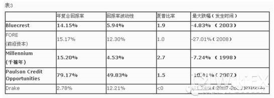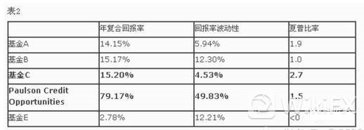 基金C是Millennium Intl Ltd(千禧年基金),对冲基金业界的常青树,旗下经理中曾有若干华裔高手。站在投资者角度,到底是选“赚得狠”的保尔森基金,还是选“赚得稳”的千禧年基金,还真有点难以取舍。另外,基金A和基金B的夏普比率都明显高于美国股市的0.4,也是不错的投资选项。而基金E的回报率竟低于无风险利率,“境界”太低了。