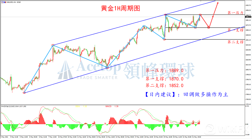 从上图黄金1H周期走势图来看, 黄金自1870附近上涨,高点在逐渐抬高,低点也在逐渐抬高,上行趋势明显,操作上可重点关注多单机会。结合MACD指标来看,DIFF线与DEA线金叉向上,并处于零轴之上,表明多头力量偏强,日内操作可在回调下方支撑1870.0附近尝试多单,目标上看1889.0附近,一旦突破此压力有望延续上涨。