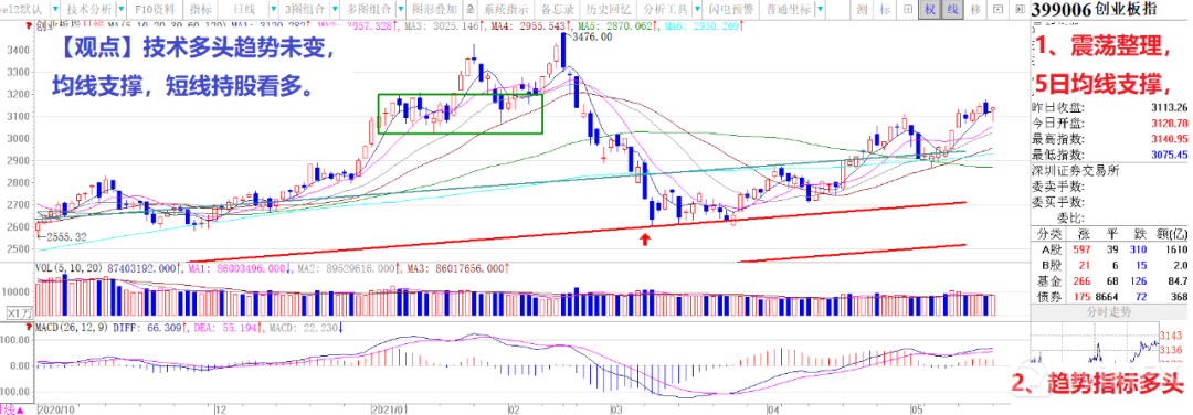 技术上,创指探底回升,5日均线继续支撑且呈现短线多头排列,沪指在箱体上方震荡整理,趋势向上同样未变,利好短线多头。