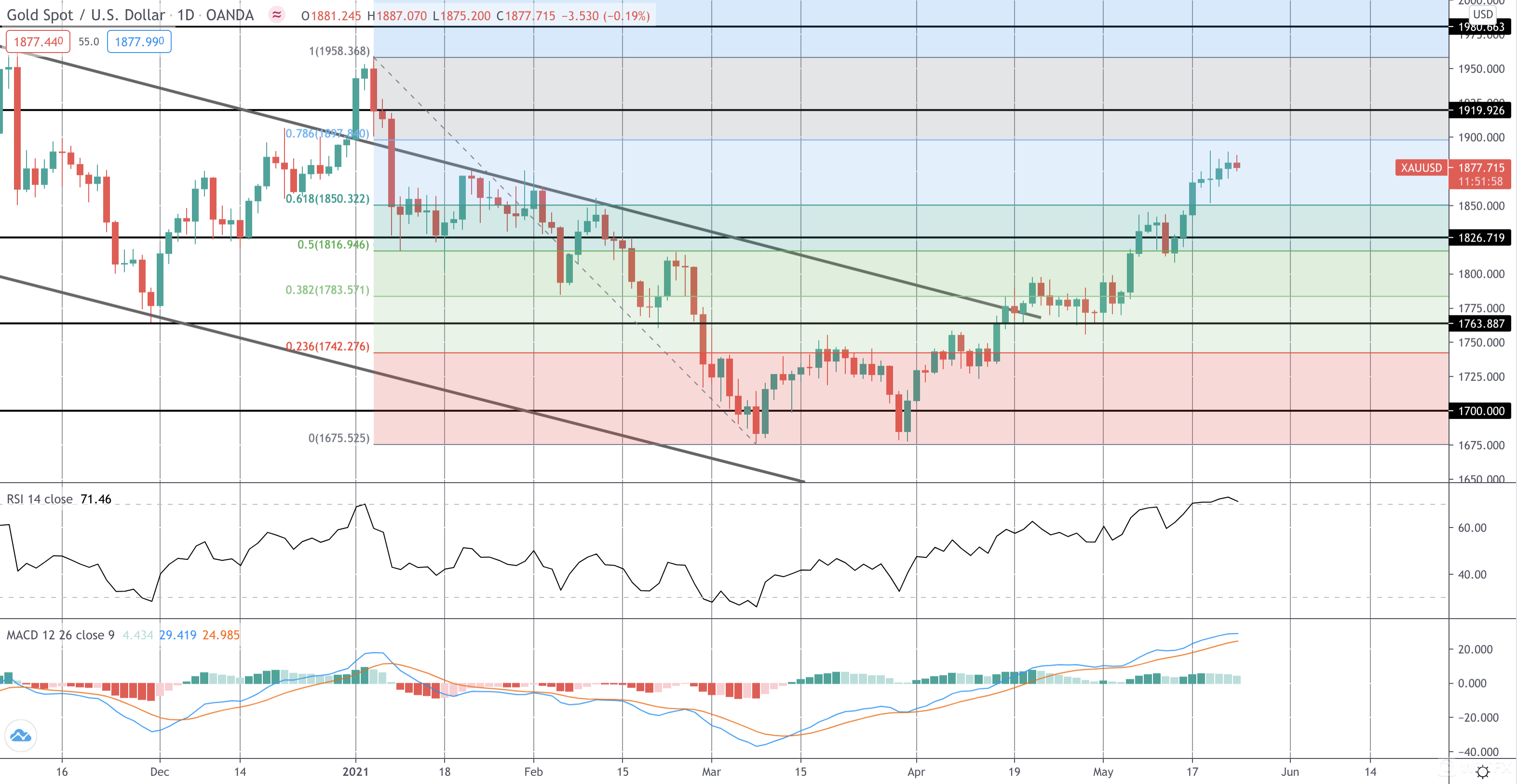黄金价格从去年的高点突破熊市通道后,市场就从高点回撤至50%的回撤位上方。 在RSI和MACD的支撑下,关注的焦点是进一步上扬,然后测试下一个61.8%的回撤位,在1900水平附近,而1919.92的水平位于该水平之上,是下一个值得关注的阻力位。
