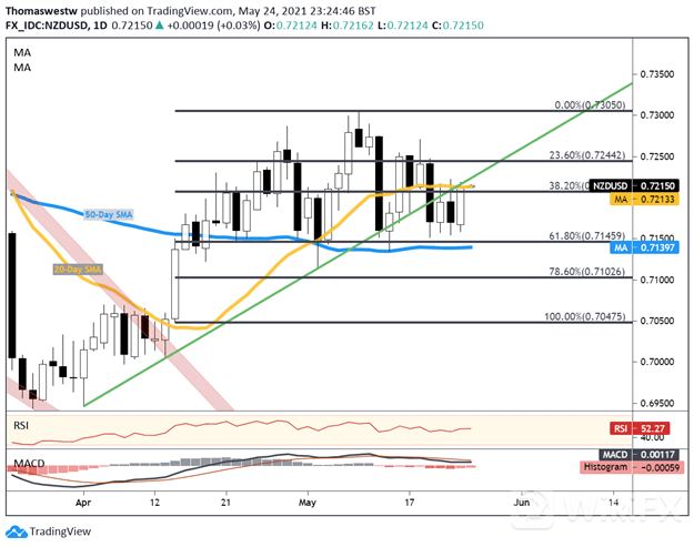 纽元兑美元在走高时试图重新获得趋势线支撑