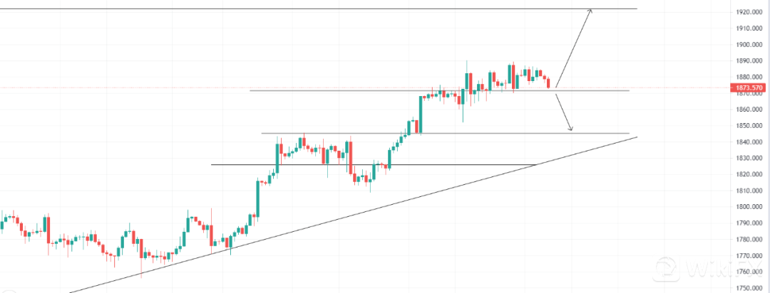 美元指数震荡下滑,黄金受阻震荡下滑,关注1871.57的支撑位,4小时回调收多即可看多至压力位1921.96位置,止损1863.70;关注1871.57支撑位,4小时跌破收空即可看空至1845.20,止损1878.00