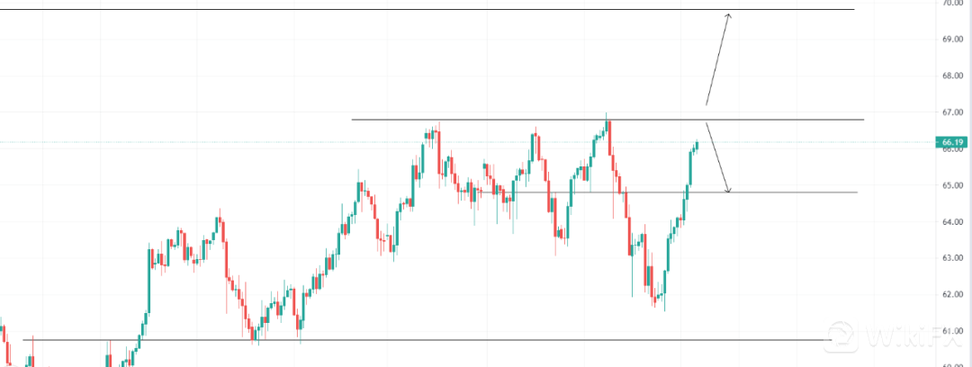 美元震荡下滑,原油受钻井数据公布利多,关注66.80的4小时压力位置,突破收多可看多至69.82,止损63.20;关注66.80压力位,4小时受阻收空即可看空至64.80,止损67.13