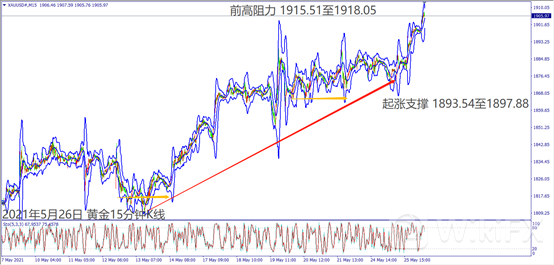 日级别线图,长阳烛突破盘整顶部,若守住1900关口,可能延续涨势;15分钟K线,近期维持盘涨走势,若守住起涨支撑,可能挑战前高阻力。