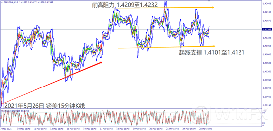 日级别线图,出现十字星反转信号,若跌破5日均线,可能回测1.4100关口;15分钟K线,近期处于区间震荡,若冲不过前高阻力,可能回测起涨支撑。